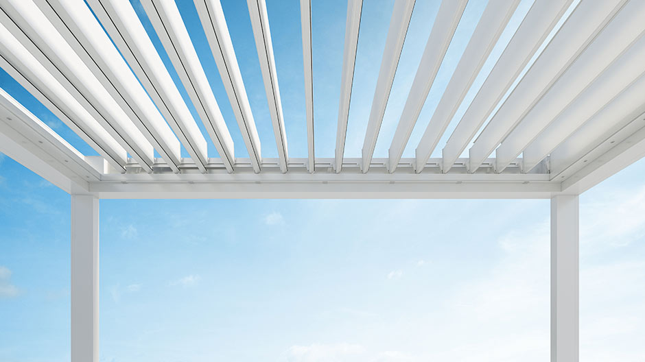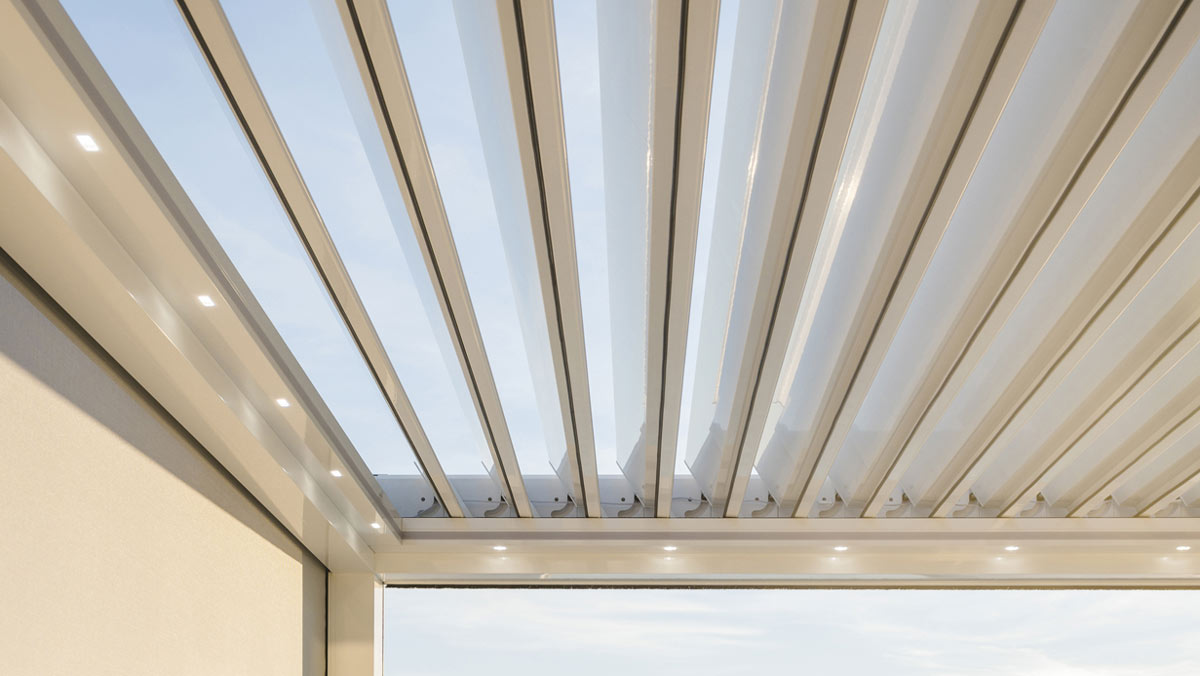 Unsere bioklimatischen Pergolen stehen in ständiger leiser Zwiesprache mit der Natur, um Ihnen bei jedem Wetter eine absolut konstante Wohlfühlatmosphäre zu bieten.