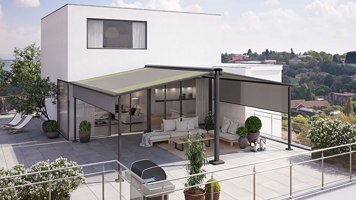 An einer oder an beiden Seiten der syncra werden je nach Anforderung Gelenkarm-Markisen oder Pergolen montiert. Das System kann fest im Boden verankert (Variante "fix") oder frei mit Beschwerungskästen aufgestellt werden (Variante "flex)."