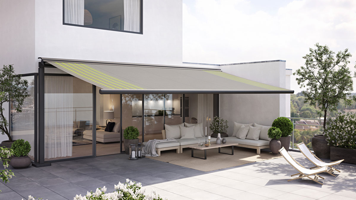 Die waagerecht ausfahrende Markise läuft bündig im Rahmen. Dies ermöglicht das tracfix System, welches das Tuch komplett fest umschließt. Dadurch bleibt die Markise im Markisendach markant windstabil bis Windstärke 6. Mit zusätzlichen Vertikalmarkisen sind Sie auch gegen Seitenwind oder tiefstehende Sonne rundum geschützt.